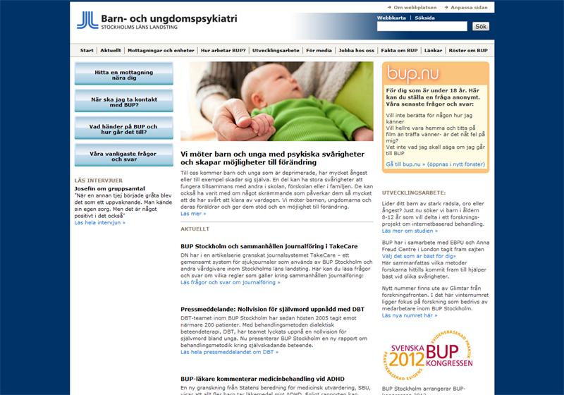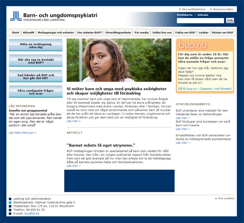 Utveckling av helt ny webbplats för BUP i Stockholm. Webbplatsen (www.bup.se) är baserad på EPiServer. Designen utfördes av Gunnar Dagnå och följer till stor del designen på sll.se. Google Maps används bl.a. för kartsöktjänst för att besökarna enkelt ska kunna hitta sin närmaste mottagning. BUPs mål är att försöka hjälpa ungdomar som har det jobbigt. På webbyrån känns det därför extra bra att kunna bistå.