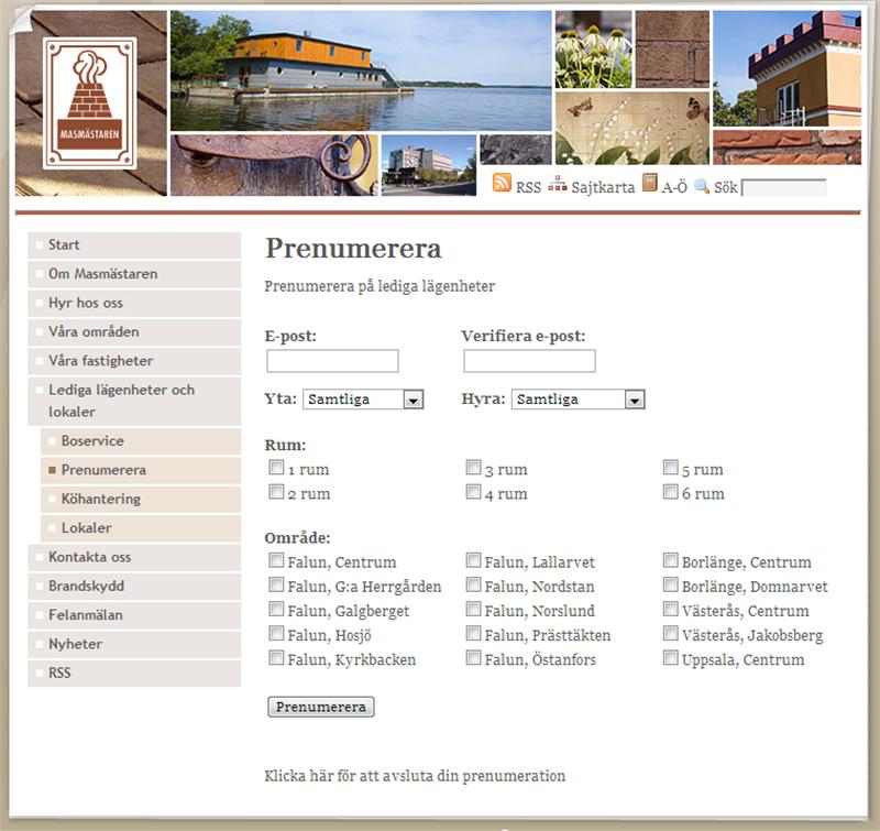 Vi har genomfört ett vidareutvecklingsuppdrag för Masmästaren där vi utökat funktionaliteten på deras EPiServerwebbplats. De har fått förbättrade möjligheter att presentera sina fastigheter och vi har också utvecklat deras kundhanteringssystem bl.a. med bättre bevakning för intresseanmälningar och möjlighet att prenumerera på lediga lägenheter. Besökaren anger sina önskemål och när en ledig lägenhet dyker upp som matchar önskemålen skickas automatiskt ett mail till kunden.